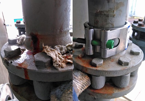 Midden in de sessie ontving een van de aanwezigen een WhatsApp-bericht met een foto van een lekke las in een 70 °C waterleiding. Bij nadere inspectie bleek het te gaan om een complexe situatie: een lekke las vlakbij een flens, met een verdikking en een DN80 leiding (88,9 mm OD). Al snel werd duidelijk dat de ‘’Repico RE DN80 repair coupling for elbows’’ hier een passende oplossing kon zijn.
